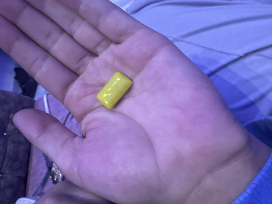 In an indoor setting within Barza Municipality, Syria, a single human hand with a light to medium skin tone is depicted, palm facing upwards and slightly open. The hand, illuminated by artificial light exhibiting a purplish tint, cradles one bright yellow, rectangular object approximately 2-3 cm in length, consistent in appearance with a piece of chewing gum. The object has slightly rounded edges and a uniform color, with no visible wrapper or damage. The background is out of focus, showing dark, tufted upholstery in the upper left and light-colored, possibly striped fabric in the lower right. No other individuals or explicit interactions are visible.