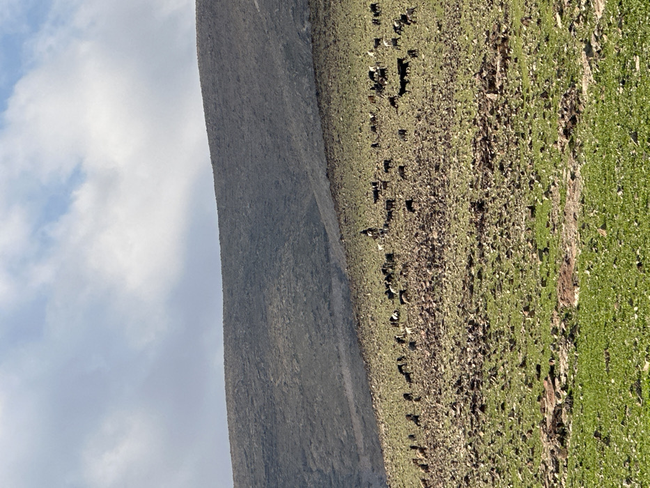 The scene depicts a rugged, vegetated hillside in Ras 'Ein al 'Auja, Palestinian Territory, under a partially cloudy sky. The upper portion of the frame shows a sky with diffused white and grey clouds against blue patches. A large, dark grey-brown mountain or elevated terrain, characterized by a rocky, sparse surface, forms the background. The midground and foreground consist of a sloped area densely covered with exposed rocks, predominantly dark grey and brown, interspersed with sparse to moderate patches of green herbaceous vegetation. A herd of approximately 50 to 70 domestic animals, identified as goats and possibly some sheep, displaying black, dark brown, and mottled white-and-dark coat colors, are scattered across the midground, engaged in grazing or standing. One individual, dressed in dark attire, is mounted on a dark-colored horse, positioned centrally within the herd, observing the animals. No other human figures or artificial structures are present.