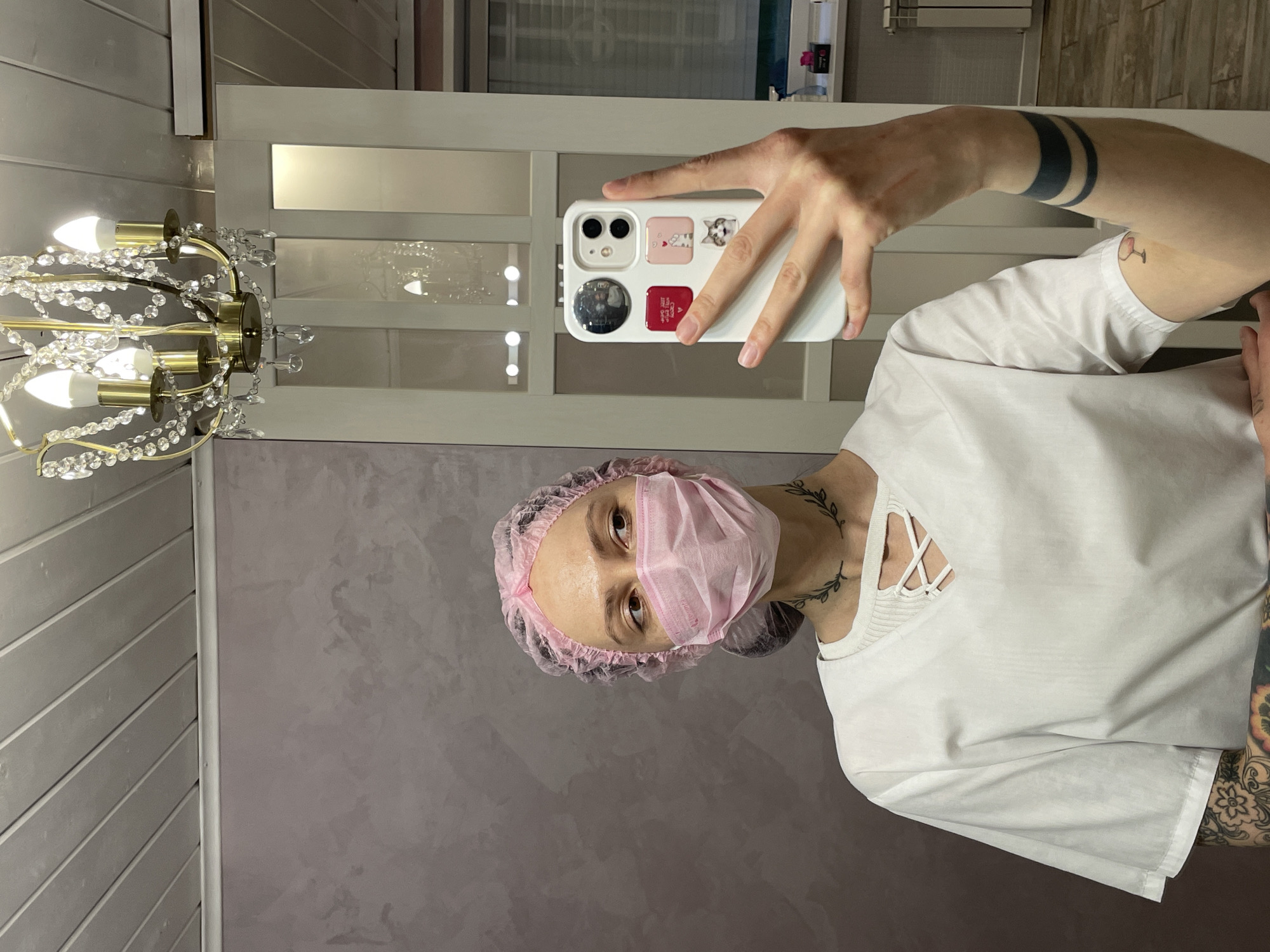 A person in a pink surgical cap and mask takes a mirror selfie with a white smartphone in a room with a gray wall