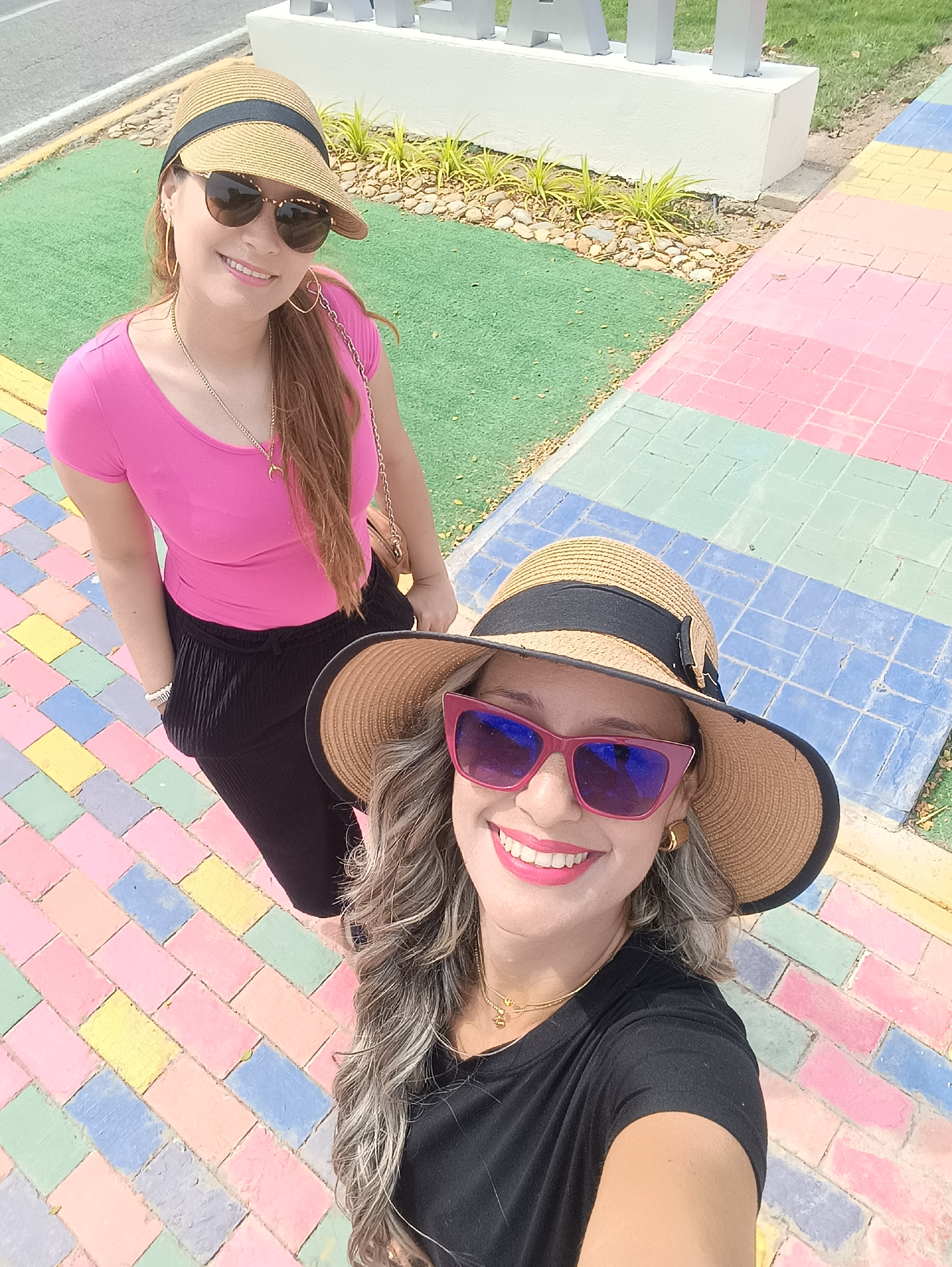Two adult females are positioned outdoors in what appears to be a public area in La Victoria, Venezuela, identifiable by large silver "LA" letters on a white monument in the background. The foreground features a colorful paved ground composed of rectangular blocks painted in pastel shades of pink, blue, yellow, and green. Adjacent to this pavement is a section of green artificial turf, bordered by a strip of small light-colored pebbles and small green plants, before meeting the white monument. A grey asphalt road with a yellow curb is visible beyond the green turf. The female in the foreground is taking a selfie, smiling directly at the camera. She wears a black short-sleeved shirt, a wide-brimmed straw sun hat with a black band, pink-framed sunglasses with reflective blue lenses, small gold hoop earrings, and a thin gold necklace. Her wavy, light-colored hair falls over her shoulders. Standing slightly behind her, to the left, is the second female. She also smiles towards the camera, wearing a bright pink short-sleeved top, a black pleated midi skirt, a straw visor with a black band, dark sunglasses, large gold hoop earrings, and a long gold necklace with a crescent moon pendant. A small tan cross-body bag hangs on her right side, and a white bracelet is visible on her left wrist. Her long, reddish-brown hair is visible behind her right shoulder.