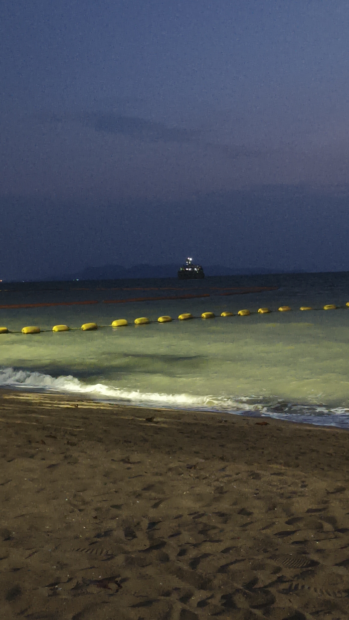 The image depicts a nighttime coastal scene at Pattaya City, Thailand, observed from the beach looking towards the sea. The foreground features dark sand with visible footprints and minimal debris. The midground shows the ocean, where gentle waves break on the shore, illuminated by an off-camera light source to a yellowish-green hue. A horizontal line of approximately fifteen yellow spherical buoys is visible across the water, delineating an area. Further offshore, a faint orange line, possibly another barrier or rope, is discernible. In the distance, on the horizon, a dark vessel with illuminated structures on its deck is positioned against the dark blue-grey night sky. Faint landmasses are visible behind the vessel. No people are present in the frame.