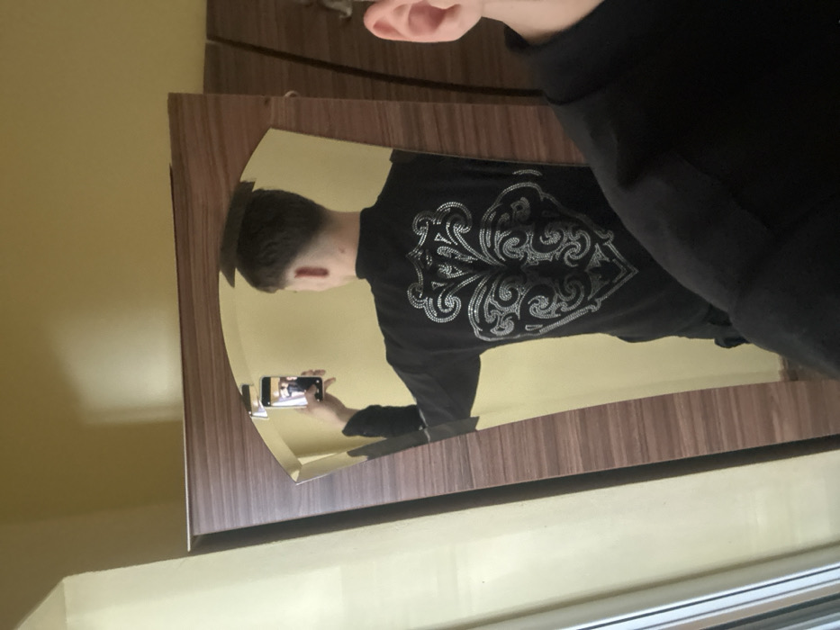 The image depicts an indoor scene, likely a residential room in Kozloduy, Bulgaria. A person is captured in a mirror selfie, with their reflection prominently featured. The individual, seen from behind in the mirror, has short, dark hair and wears a black long-sleeved shirt with a large, elaborate silver or grey decorative motif on the back, resembling an ornate crest or floral pattern. Their left arm is raised, holding a white smartphone, which is actively displaying their reflection on its screen as they capture the image. A portion of the individual's right ear and shoulder/upper arm are visible in the extreme foreground on the right side of the frame, out of focus. The mirror has a curved top edge and is set within or against a piece of brown wooden furniture with a horizontal grain. The surrounding walls are a plain light yellow or beige color, providing a simple background for the mirrored subject.