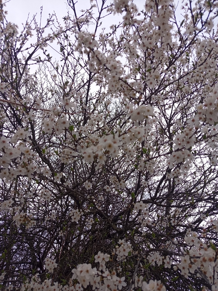 The image, captured in Goce Delcev, Bulgaria, presents an upward-angled view into the canopy of a deciduous tree. The tree's intricate, dark brown branches are densely covered with numerous small, five-petaled white blossoms, interspersed with scattered nascent green leaves. The background is an undifferentiated, light grey overcast sky. No individuals, animals, or artificial structures are visible within the frame; the scene is static.