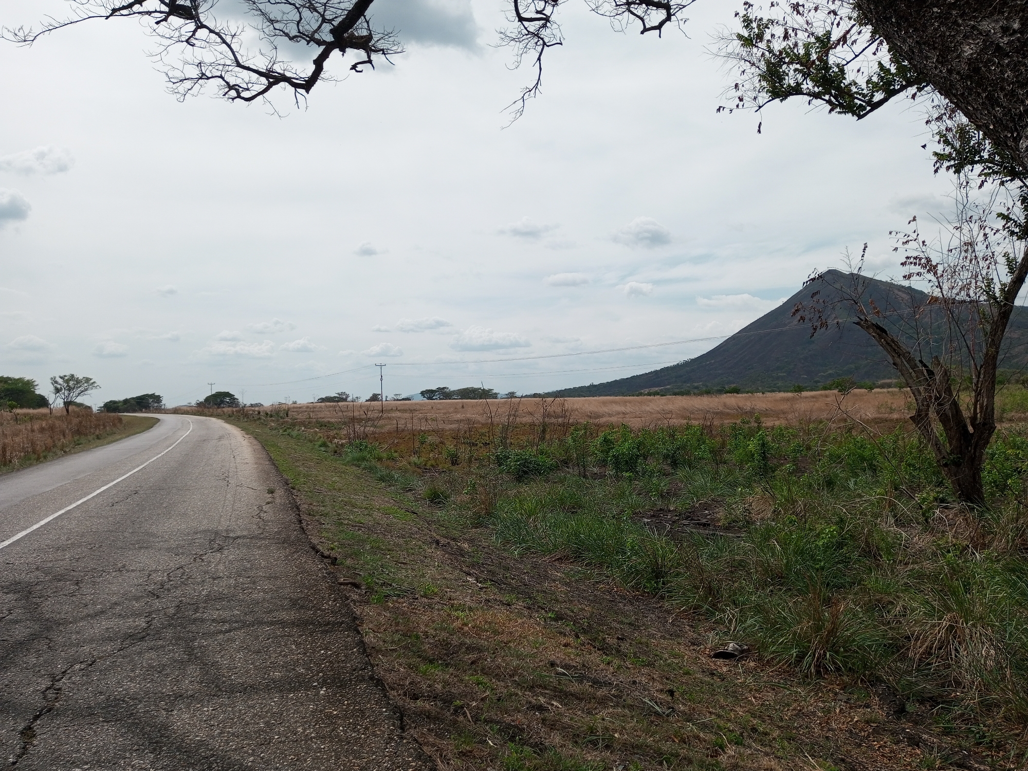 A rural landscape is depicted under an overcast sky. A paved road with a white line marking the edge curves to the left. The asphalt is cracked and worn. To the right of the road, the terrain transitions into dry grasses and patches of green vegetation. In the background, a mountain rises prominently. Sparse trees are scattered across the landscape. The upper portion of the frame features tree branches, some bare and some with foliage. No people are visible. The location is the rural area of Gamelotal, Venezuela.