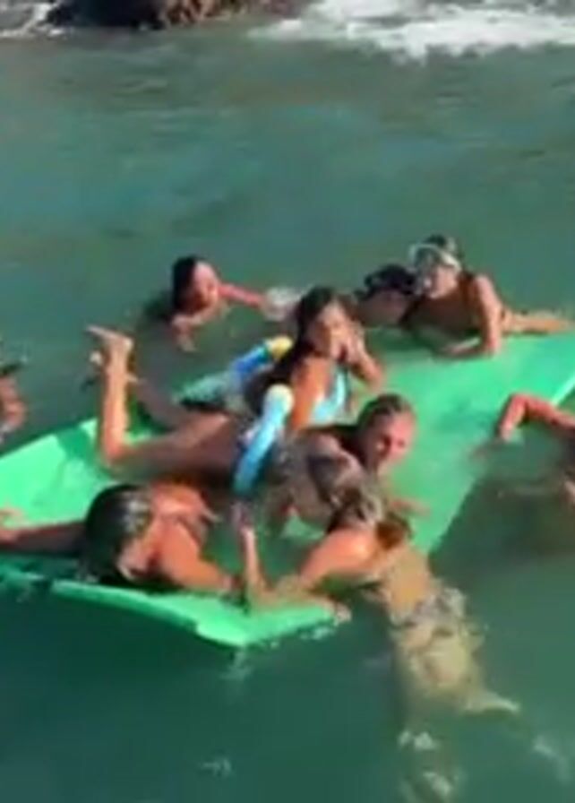 A group of about ten young women are in the ocean, close to a rocky shoreline with crashing waves. Most of them are in the water, holding onto or lying on a green rectangular floating mat. The water is a clear, turquoise color. Some of the women are smiling and laughing. One person, presumably the one filming, has blonde hair visible in the foreground.