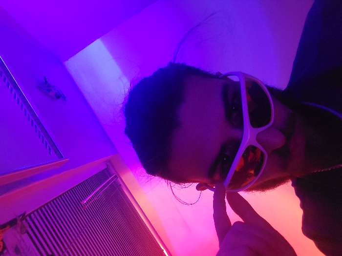 - "An adult male is observed in a close-up portrait, positioned indoors under dual-source artificial lighting, projecting magenta hues on the left and purple on the right" by FM-Zgw5o1, licensed under CC BY 4.0