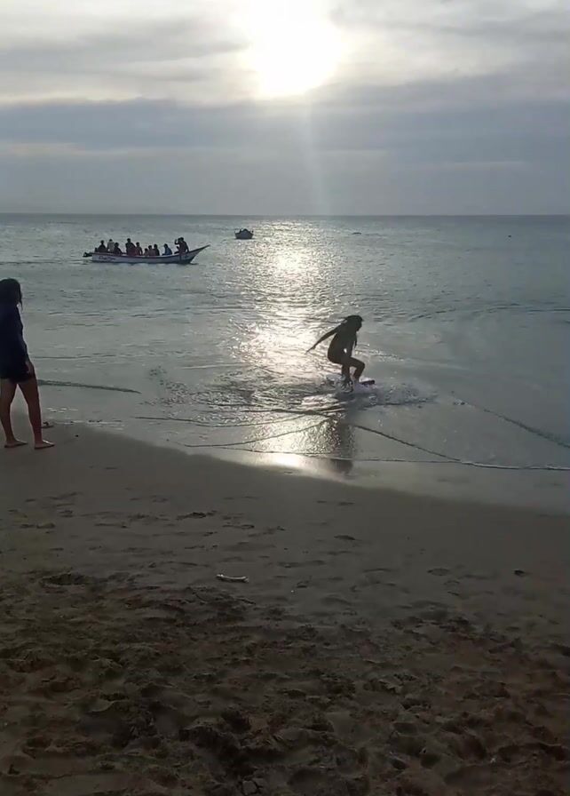 beach scene with a woman attempting to skimboard. The woman, wearing what appears to be a bikini, runs towards the water, drops the board, and attempts to jump on, but falls and ends up lying in the shallow water. To the left, a person stands watching, and at one point raises their arms in apparent encouragement or support. In the background, a boat filled with people is visible on the water under a cloudy sky with the sun shining through. The beach is sandy.