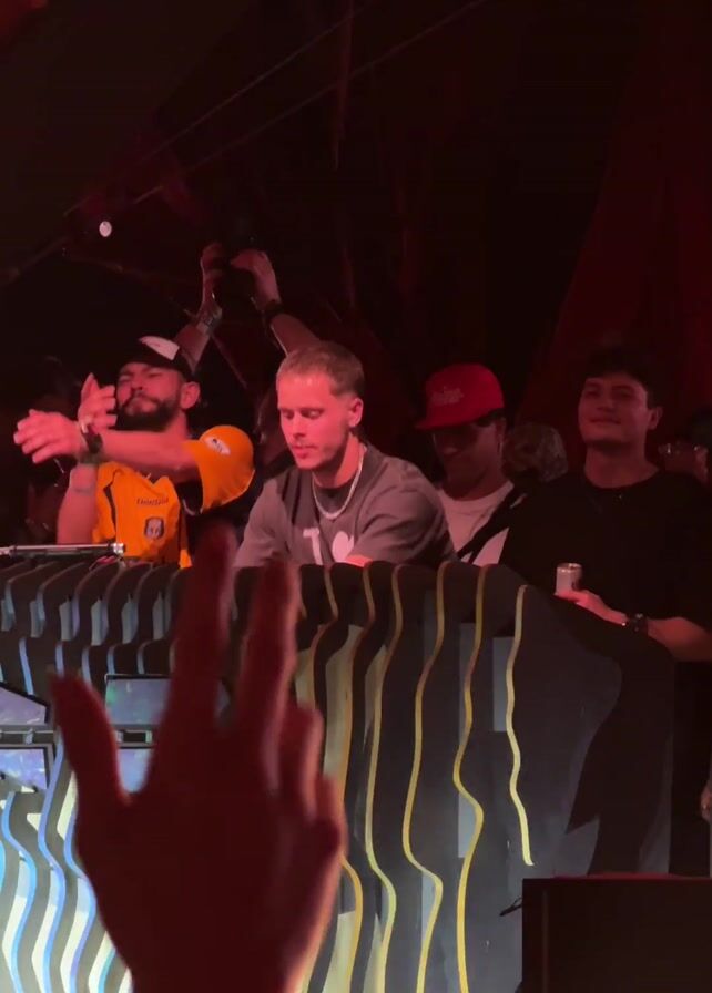 group of people in a nightclub environment. In the foreground, a hand is raised in the air, blurred from motion. Behind the hand, four men stand behind a DJ booth decorated with a black wavy design outlined in yellow and light blue. The man in the center wears a grey t-shirt and a silver chain necklace. He is standing calmly, looking at something in front of him. To his left, a man in a yellow sports jersey with a white cap is clapping his hands. To the center man's right, two other men are standing with a more relaxed demeanor, one wearing a red baseball cap. The nightclub has dim lighting with a mix of red and purple hues. The background is filled with indistinct figures and decorations.