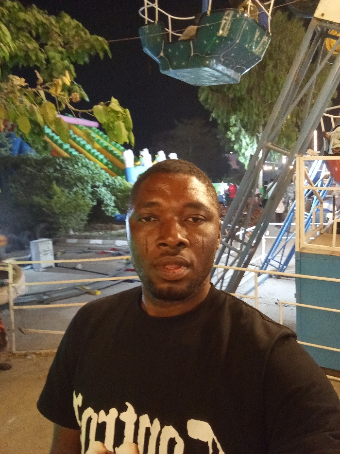A man takes a selfie outdoors at night. He wears a black shirt with white writing. Behind him is a Ferris wheel, an inflatable slide, trees, and lights. The man has dark skin and short hair. It looks like there might be some markings on the man's face. The scene appears to be a carnival or amusement park.