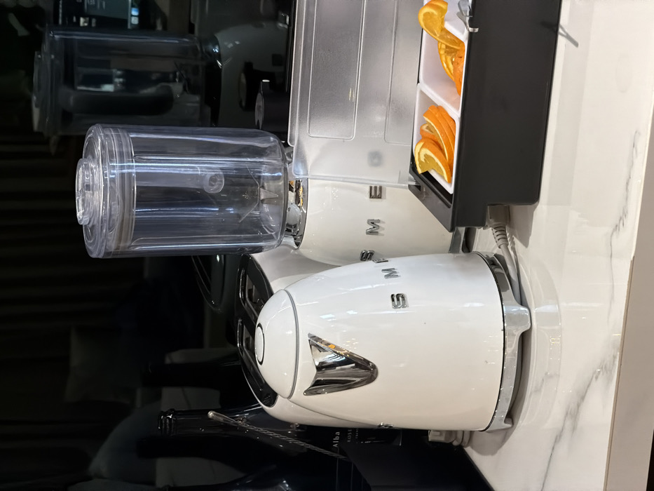 The scene depicts a close-up of a static arrangement of kitchen appliances and food items on a countertop in an indoor setting in Canggu, Indonesia. A white marble-patterned countertop serves as the base. On the left, a white Smeg electric kettle with chrome accents is positioned, plugged into a power outlet. Behind it, a dark container holds multiple dark glass bottles, one partially labeled "Alba Rose." In the center, a white Smeg blender with a clear plastic container and chrome base sits adjacent to the kettle, also plugged in. Immediately behind the kettle and blender, the top portion of a white Smeg toaster is visible, showing two slots. To the right of the blender, a black rectangular serving container with two white inserts holds numerous crescent-shaped orange slices. A translucent plastic lid is partially open over this container. The background is a dark, reflective surface, mirroring indistinct shapes consistent with interior furnishings. No individuals are present.