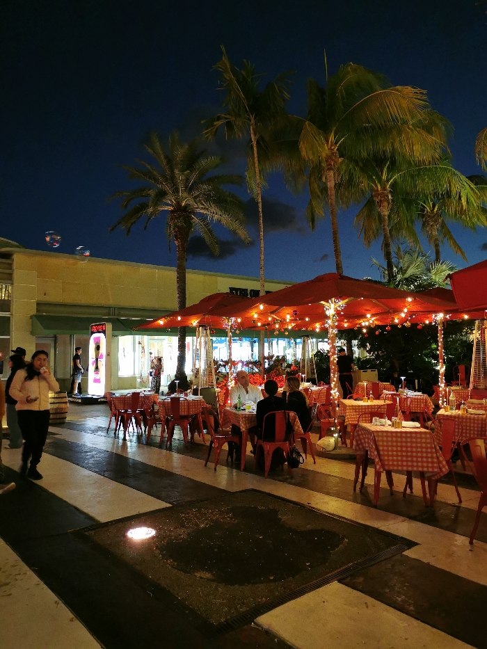 An outdoor restaurant scene at night, featuring red checkered tablecloths and string lights illuminating the tables under red umbrellas. Palm trees stand tall in the background against the dark sky. Diners are seated at some of the tables. A woman is walking on the left side of the image. A modern, low building with a green awning is visible behind the restaurant area. Bubbles float in the air above the building.