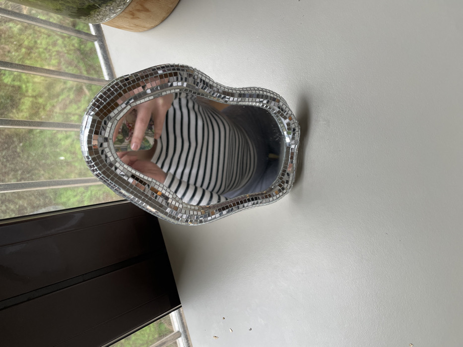 - "The image displays an irregularly shaped mirror, framed with small square mirror tiles, resting on a light-colored, flat surface indoors in Boreti, Montenegro" by FM-GgSpJ3, licensed under CC BY 4.0
