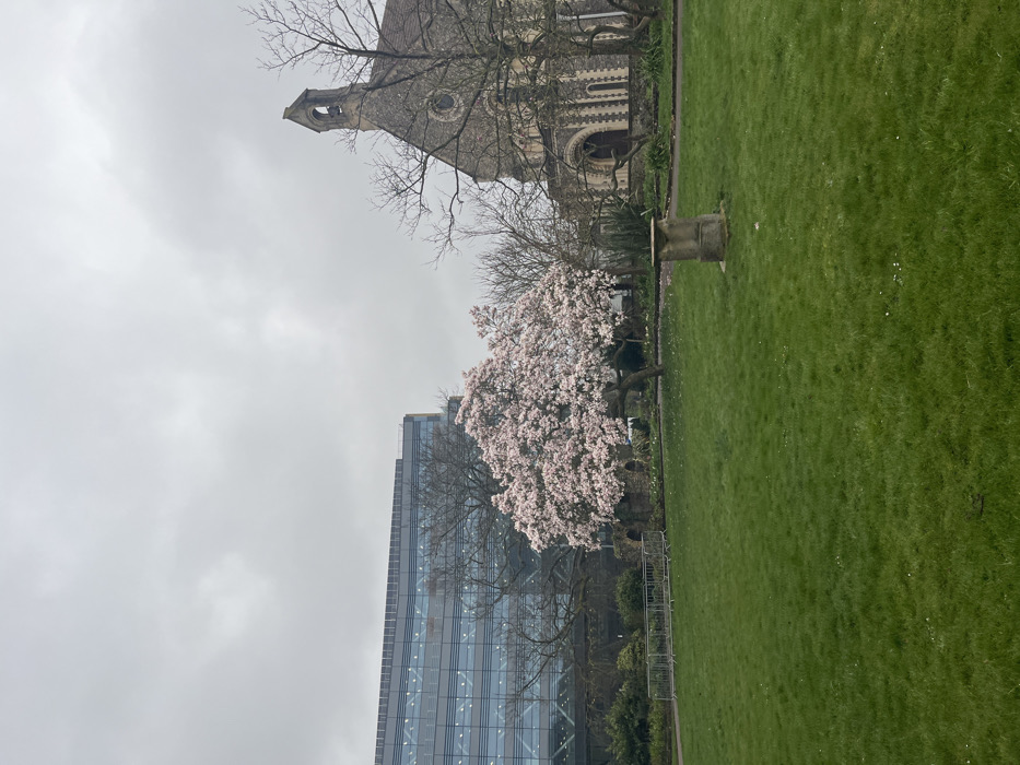 The image displays a static outdoor scene within Forbury Gardens, Reading, United Kingdom, under a uniformly overcast grey sky. The foreground consists of a vibrant green lawn. In the lower right quadrant of the lawn, a weathered, cylindrical stone pedestal is centrally positioned. The midground features a large, deciduous tree heavily laden with pink blossoms, consistent with a magnolia, situated slightly left of center. To the immediate left of this tree, two silver metal crowd barriers are visible. Behind the flowering tree, partial stone ruins are present. To the right, a historic stone church building, identifiable as St. Laurence's Church, stands with a prominent bell tower, arched windows, and a façade constructed from alternating light and dark stone. Several bare deciduous trees are situated around the church. In the background on the left, a multi-story modern office building with a reflective glass facade is visible, mirroring the cloudy sky. No people are present in the scene.