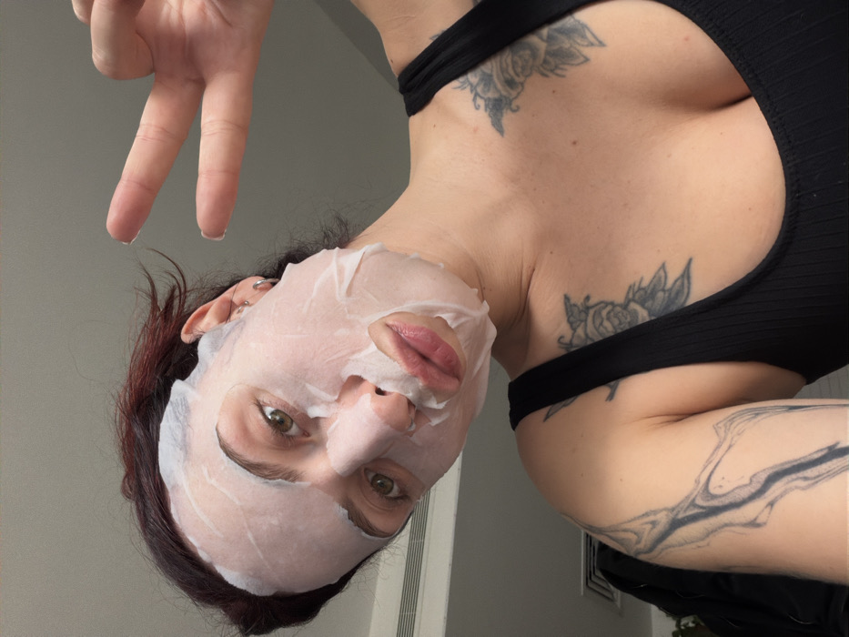 A close-up, angled shot depicts a single individual, presumed female, indoors. The subject has dark reddish-brown hair and light-colored eyes. A white sheet mask covers the majority of the face, with cutouts for the eyes, nostrils, and mouth. The lips are slightly parted. Multiple silver-toned piercings are visible on the subject's left ear. The subject is wearing a black, ribbed tank top or sports bra. Visible tattoos include a large, dark floral design on the upper right chest and a swirling, abstract pattern on the upper left arm. The subject's right hand is raised, forming a "V" or peace sign with the index and middle fingers extended. The background consists of a plain, light-colored wall with a partial view of a horizontal air vent on the left. The specific location within Tel Aviv-Yafo, Israel, cannot be determined from the visual information provided in the image.