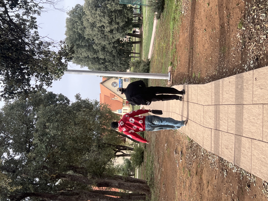 two male individuals walking away from the camera on a paved pathway within an outdoor setting identified as the campus of Al Akhawayn University in Ifrane, Morocco. The individual on the left is wearing a red hoodie with white circular patterns, light blue denim jeans, and light-colored athletic shoes. He carries a small, dark-colored pouch or bag in his right hand. The individual on the right is dressed in a black jacket displaying a white "Puma" logo on the left chest area, black trousers, and dark athletic shoes. He wears a light-colored cap. Both individuals are walking in parallel on a path constructed from light beige rectangular pavers. The immediate surroundings consist of reddish-brown soil with scattered dry leaves and patches of green grass. Numerous mature trees with dense green foliage line the pathway and fill the background. Directly behind the walking figures, several buildings with distinct orange-tiled pitched roofs and light-colored facades are visible; one prominent building features a large, round window. A tall, light-colored pole stands vertically to the right of the path. In the further background to the right, a fenced area with green netting, possibly a sports court, is partially visible, along with distant, indistinct human figures. The sky is overcast and appears light gray.