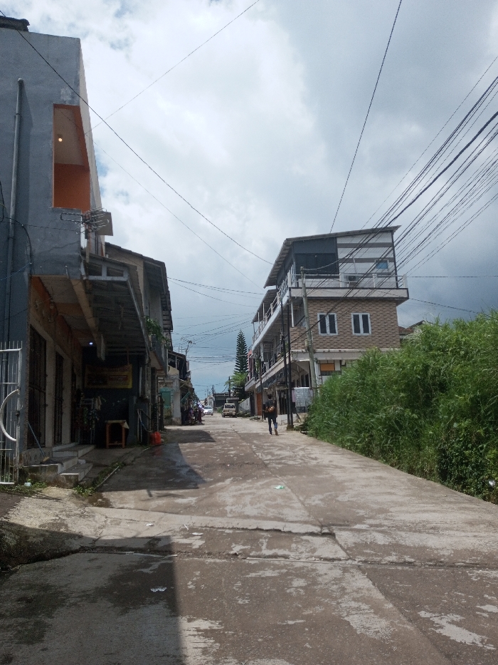 The image displays an urban street scene in Ura-Dozhi, Bhutan, viewed from a slightly elevated position looking down a paved road. The sky is largely overcast with scattered white and grey clouds, and numerous black electrical or communication wires crisscross overhead, strung between unseen poles. On the left side of the concrete road, which shows signs of wear and minor discoloration, stands a grey multi-story building. Its upper visible floor features a rectangular cutout revealing an orange interior wall with a light fixture. Below this, an older television antenna is mounted, and a sheltered area with a corrugated roof extends over the sidewalk level, where multiple storefronts, some with metal gates, are present. A small wooden stool sits outside one of these establishments. On the right side of the road, a taller, beige and white multi-story building is visible, featuring multiple balconies and white-framed windows. Its topmost section has a distinct modern design with a sloped roof and horizontal paneling. Adjacent to this building and bordering the road is a dense patch of tall, green vegetation, primarily tall grasses or reeds. A single person, dressed in dark clothing, is walking away from the viewer along the right side of the road. In the mid-ground and distance, the road continues, lined by additional buildings of varying heights and designs. Several vehicles, appearing to be cars or vans, are present further down the street. A prominent tall, slender conifer tree rises above the rooftops on the right side of the street in the distance. The overall scene suggests an active but not heavily congested commercial or residential street.