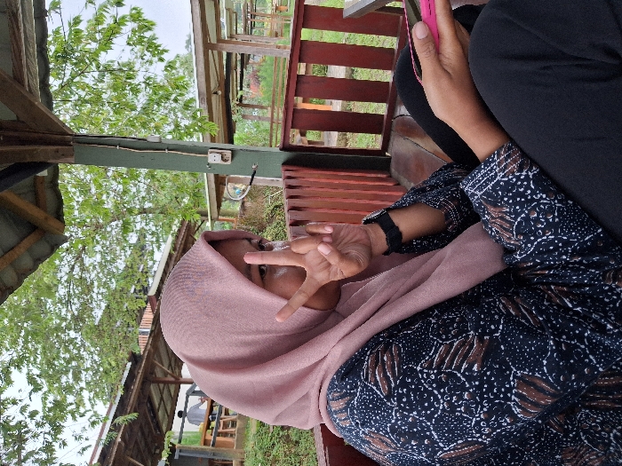 A person wearing a headscarf and patterned top sits outside in a gazebo-like structure. The individual holds up a peace sign with their right hand, partially obscuring their face. Another person sits beside them, holding a pink phone. The scene includes wooden railings and greenery. Part of a tree is visible on the left side of the image.