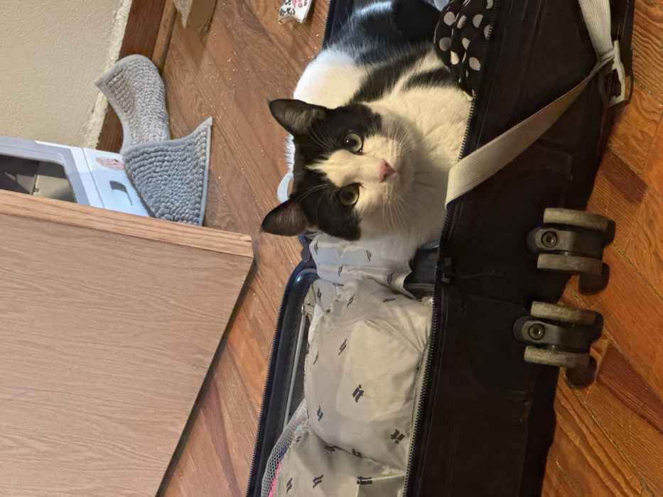 - "A black and white domestic cat with green eyes and a pink nose rests inside an open, dark-colored suitcase on a light brown wooden floor" by FM-wiiP12, licensed under CC BY 4.0