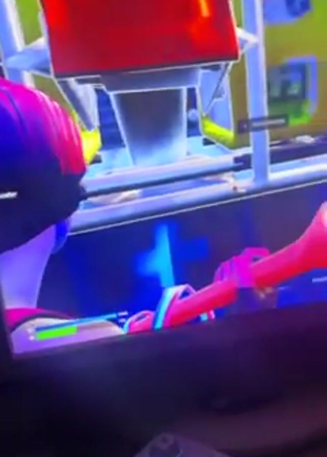 A young woman is playing a video game on a computer. The game appears to be Fortnite. She is using a keyboard and mouse to control her character. The room is dimly lit. There is a cabinet behind her.