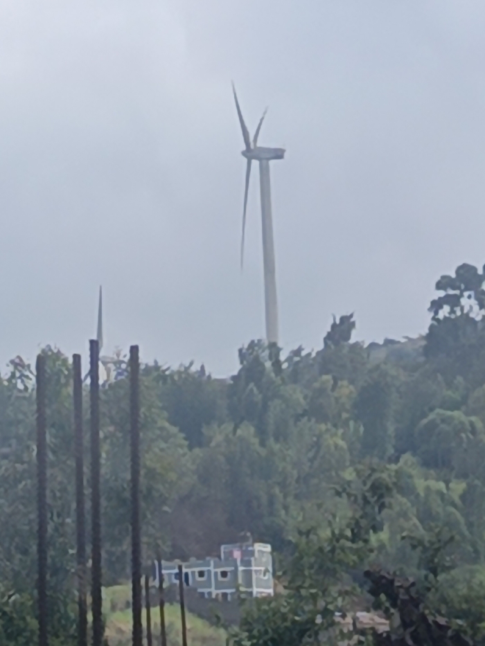 A hazy day obscures the view of a landscape featuring wind turbines. The tallest turbine is centered in the frame, its blades partially visible. Behind it, dense green trees cover a hill. In the foreground, several dark, vertical bars stand before the foliage. A building with a grey exterior is nestled amidst the trees near the bottom center of the image. The sky is overcast and pale.