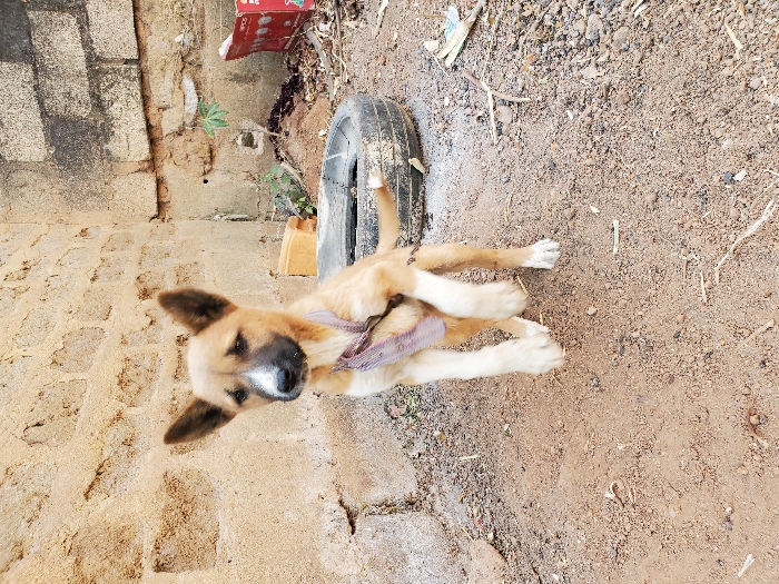 A medium-sized, tan-colored dog with a dark muzzle and white markings lies on its back on a dirt and brick surface. The dog's legs are splayed, with white paws visible. A purple and white striped cloth is draped around its chest, possibly a makeshift harness. A tire sits near the dog. The background includes brick and dirt, with sparse vegetation and debris visible.