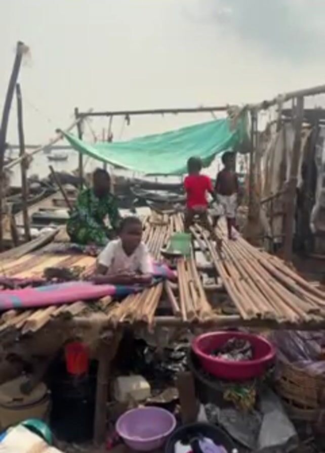 A woman in a patterned green dress sits next to a child lying on a mattress atop a bamboo platform. Two other children, one in a red shirt and the other shirtless, stand on the bamboo platform. The structure appears to be elevated, possibly over water, with boats visible in the background. The surroundings include assorted containers, baskets, and laundry hanging. A makeshift green tarp provides some shade. The sky is overcast.