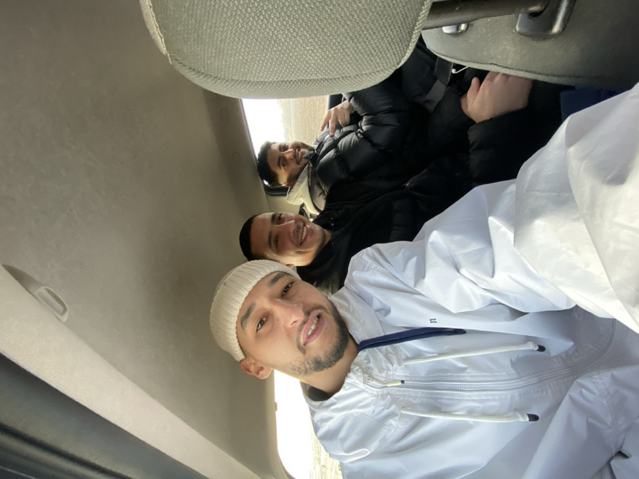 A photograph taken inside a vehicle depicts three adult males. The individual in the foreground, positioned to the left, wears a light-colored beanie and a white hooded jacket, appearing to hold the camera. He has a short beard and is smiling directly at the lens. Behind him, a second male with short dark hair and a light beard wears a dark puffer jacket and smiles towards the camera. Further to the right and rear, a third male, also with dark hair and a short beard, wears a dark puffer jacket over a light-colored hoodie; he is smiling and displays a peace sign with his right hand. The vehicle's interior shows a light-colored ceiling with a grab handle and a gray, textured fabric headrest in the bottom right. Through the vehicle's windows, a flat, light-colored field is visible under an overcast sky, suggesting an open, rural-like outdoor environment. The specific location within La Wantzenau, France, is not visually discernible from the image content.