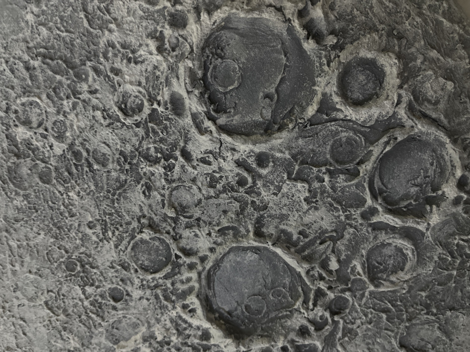 - "The image displays a close-up, highly textured, monochromatic surface primarily in shades of grey, ranging from dark charcoal in recessed areas to lighter, almost off-white on elevated ridges and crater rims" by FM-BhCGm1, licensed under CC BY 4.0