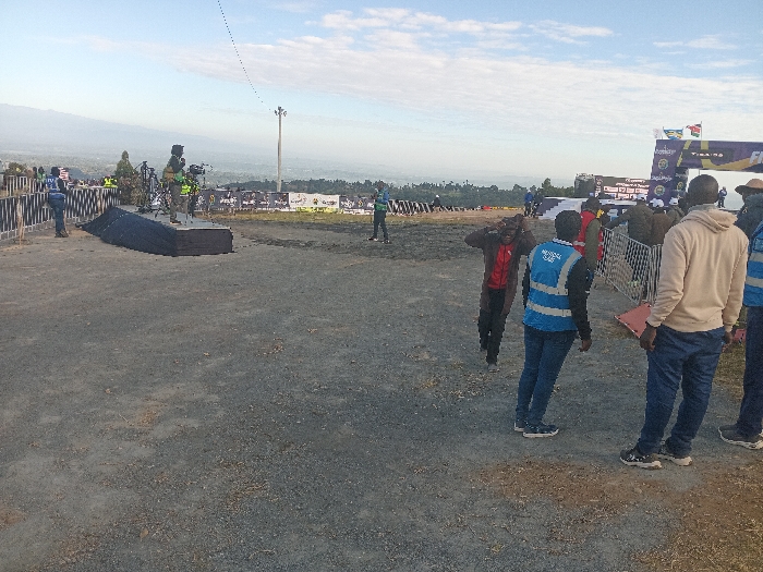 An outdoor event with a stage set up for cameras and speakers. People are milling around, some wearing official vests. A banner with text and flags is visible in the background. The scene appears to be overlooking a distant cityscape. The ground is gravelly. The sky is overcast.
