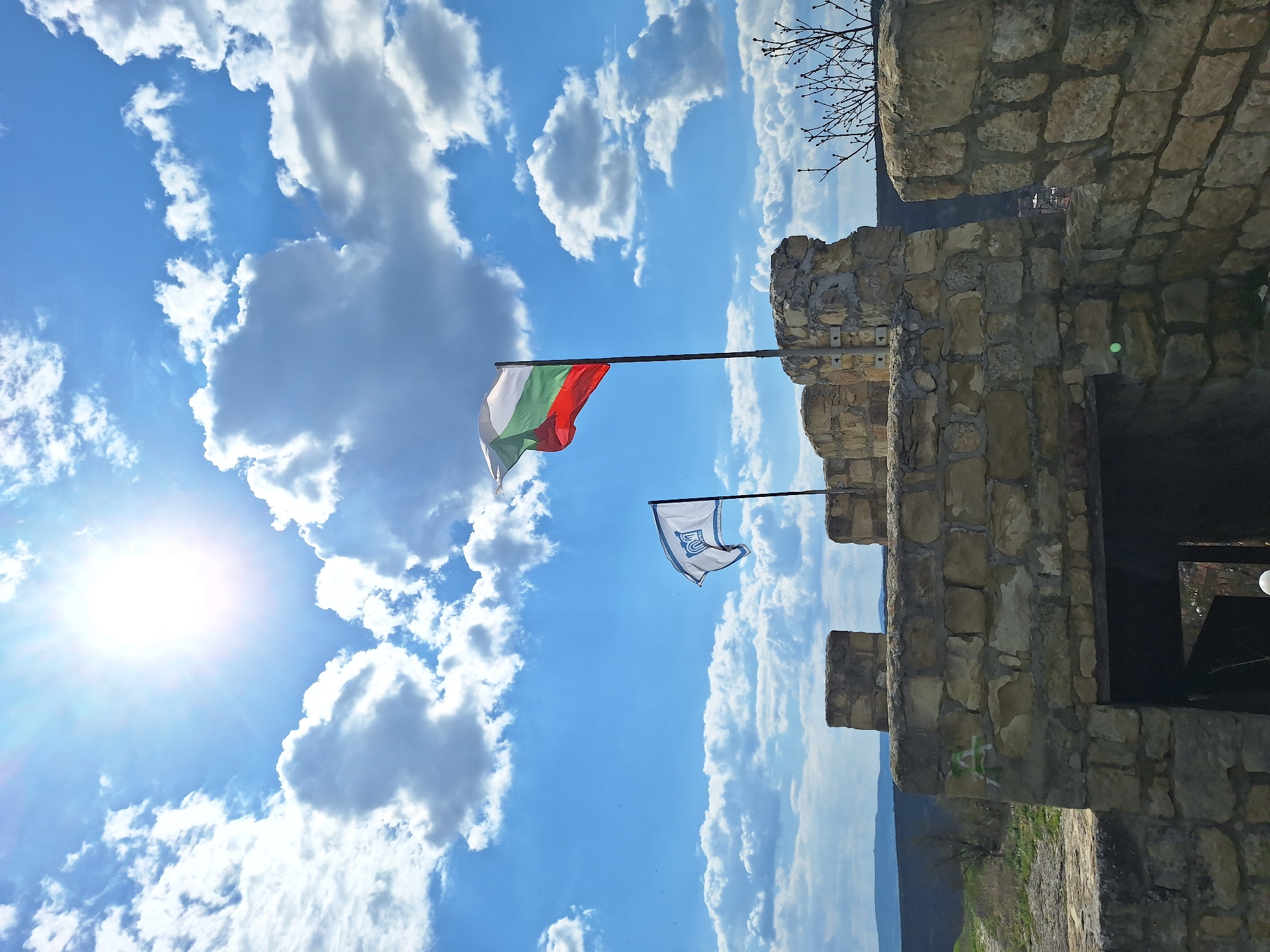 The image captures a scene at the medieval Ovech Fortress in Provadia, Bulgaria. The sky is bright blue with fluffy white clouds and the sun shines intensely in the upper left portion. Two flags are attached to poles extending from the stone fortification walls. The top flag features the white, green, and red tricolor of Bulgaria. Below it is a white flag emblazoned with the blue emblem of Provadia. The stone walls of the Ovech Fortress are weathered and exhibit varying textures and colors. Bare tree branches extend above the walls. Below, there are hints of greenery and a distant horizon.