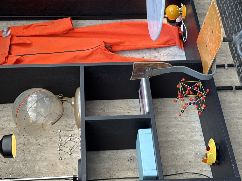 This image captures a static interior or semi-outdoor display located in Dusseldorf, Germany. The scene is dominated by a black, multi-tiered shelving unit positioned against a textured concrete wall. On the top shelf, from left to right, a portion of a black metallic lamp arm is visible, followed by a black, cylindrical downward-facing light fixture emitting a warm glow. To its right rests a clear, translucent globe on a dull metallic stand, featuring faint red lines marking geographical divisions. Adjacent to the globe is a complex geometric sculpture constructed from metallic rods and spheres, forming an intricate atomic or crystalline structure. The middle shelf holds a light blue, rectangular box on the left, and a stack of magazines or printed materials on the right. The bottom shelf features a yellow, streamlined toy vehicle with small red wheels on the left. To its right is a colorful chemical model, an octahedral arrangement of red, black, and yellow spheres connected by thin rods. To the right of the shelving unit, an orange full-body jumpsuit hangs vertically against a dark background, possibly within a recessed alcove. A prominent black zipper runs down its front, and an American flag patch is visible on the upper right sleeve (viewer's left). Below the jumpsuit, a circular table with a light-colored, possibly marble, top is partially visible. A small, spherical yellow object, resembling a decorative lamp, rests on the table, connected by a white cable. A vintage-style chair, featuring a light brown wooden seat and backrest with a gray metal frame, is positioned in the foreground, facing the table. The floor beneath the chair appears to have a dark, possibly grated, surface. No individuals are present in the scene, and no overt actions or interactions are depicted.