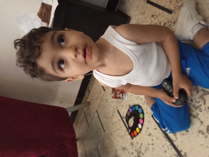 The scene is set in an interior room within Rukn ad-Din Municipality, Syria. A young child, appearing to be a toddler, is seated on a light-colored, mottled tiled floor, facing slightly left of the camera. The child has curly brown hair, brown eyes, and a fair complexion, and is dressed in a white sleeveless undershirt and blue athletic shorts with white stripes. A white shoe is visible on the child's left foot, marked with "WN". Dark smudges are present around the child's mouth. The child holds a black remote control device in both hands and looks upwards and to the right. In the background, to the left, a portion of a dark red upholstered armchair with a silver-colored leg is visible. To the right, a dark furniture piece stands against a light-colored wall, supporting a piece of chocolate cake placed on a white napkin or paper. On the floor to the child's left, a black artist's palette with multiple colored paint dots is present. Behind the child's right leg, a red and white object, possibly a book or small box, is partially visible. Dark, thin strips of adhesive tape are applied to the tiled floor.