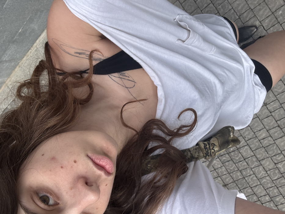 A female individual is depicted in a close-up, top-down perspective, partially obscuring her face and upper torso. She has long, wavy, reddish-brown hair. Her right eye, nose, and mouth are visible, with several small blemishes present on her right cheek and near her nose. She is wearing a loose-fitting white t-shirt, which is off-the-shoulder on her left, revealing a black bra strap and an abstract, black line-art tattoo on her left upper chest and shoulder. A single breast pocket is visible on the right side of the white t-shirt. A bronze-colored, patinated object, possibly a statuette, with identifiable text "APX" and "GVS" on a band, rests partially visible on her left shoulder/chest area. Black shorts or a similar garment are visible beneath the white t-shirt, and a pointed-toe black shoe is visible on the lower right. The ground is paved with grey rectangular stones. The specific location within the city of Givatayim, Israel, is not discernible from the provided image.