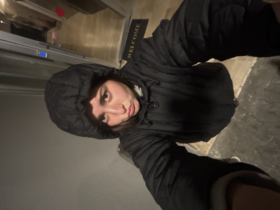 A young woman in a black hooded puffer jacket takes a selfie. She has fair skin, dark hair partially visible under the hood, and a nose ring. The background shows a dimly lit entryway with a "WELCOME" mat. The composition is angled, with the woman's face tilted towards the camera. Surfaces appear to be concrete and tile.