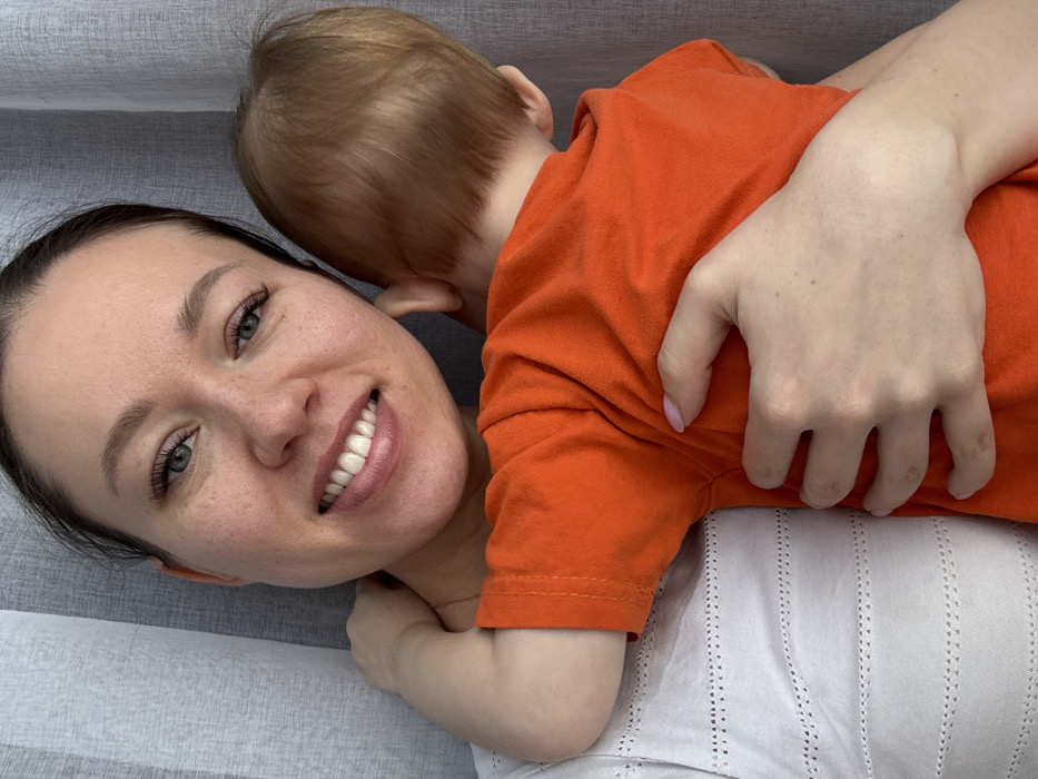 A portrait-oriented image captured in the city of Ферма, Russia, displays an adult female embracing a young child indoors. The adult female, with dark hair, green eyes, and a light complexion featuring subtle freckles, is positioned on the left and center, smiling directly at the camera. She is clad in a light-colored garment with a horizontal perforated pattern. Her visible left hand, adorned with pink nail polish, supports the child's back. The child, an infant or toddler, is visible from behind on the right, possessing light reddish-brown hair and wearing an orange short-sleeved t-shirt. Its right arm is draped around the adult female's left shoulder. The background consists of light-colored, vertically hanging fabric, consistent with curtains.