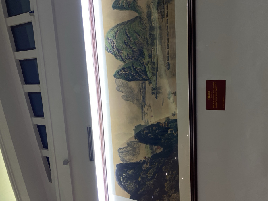 The scene depicts an interior wall within a building in Dongcheng District, China. A large, horizontal landscape painting is centrally mounted, framed in dark brown. The painting illustrates a traditional Chinese river scene, characterized by numerous lush green karst mountains, a winding river with multiple small boats, and scattered traditional structures along the banks and hillsides. Above the painting, a long, linear white light fixture illuminates the artwork. Directly above the light, a rectangular air vent is visible in the ceiling. The ceiling structure above the vent includes an angled section on the left and a series of framed, dark rectangular windows. A white spherical device (e.g., smoke detector or sensor) is affixed to the ceiling structure above the left portion of the painting. A small blue object is also visible near the rightmost window. Below the painting, on the light-colored wall, a red rectangular sign with white Chinese characters is mounted, bearing the title "漓江行" (Li River Journey). No individuals or explicit actions are observed.
