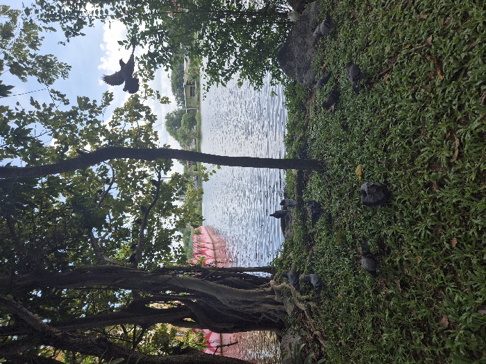 A tranquil lakeside scene featuring a flock of pigeons resting on lush, green grass along the bank. A bird takes flight amidst the foliage. Water reflects the sky, framed by tree branches. A reddish structure extends into the water. The image is angled sideways, causing a disorientation of perspective.