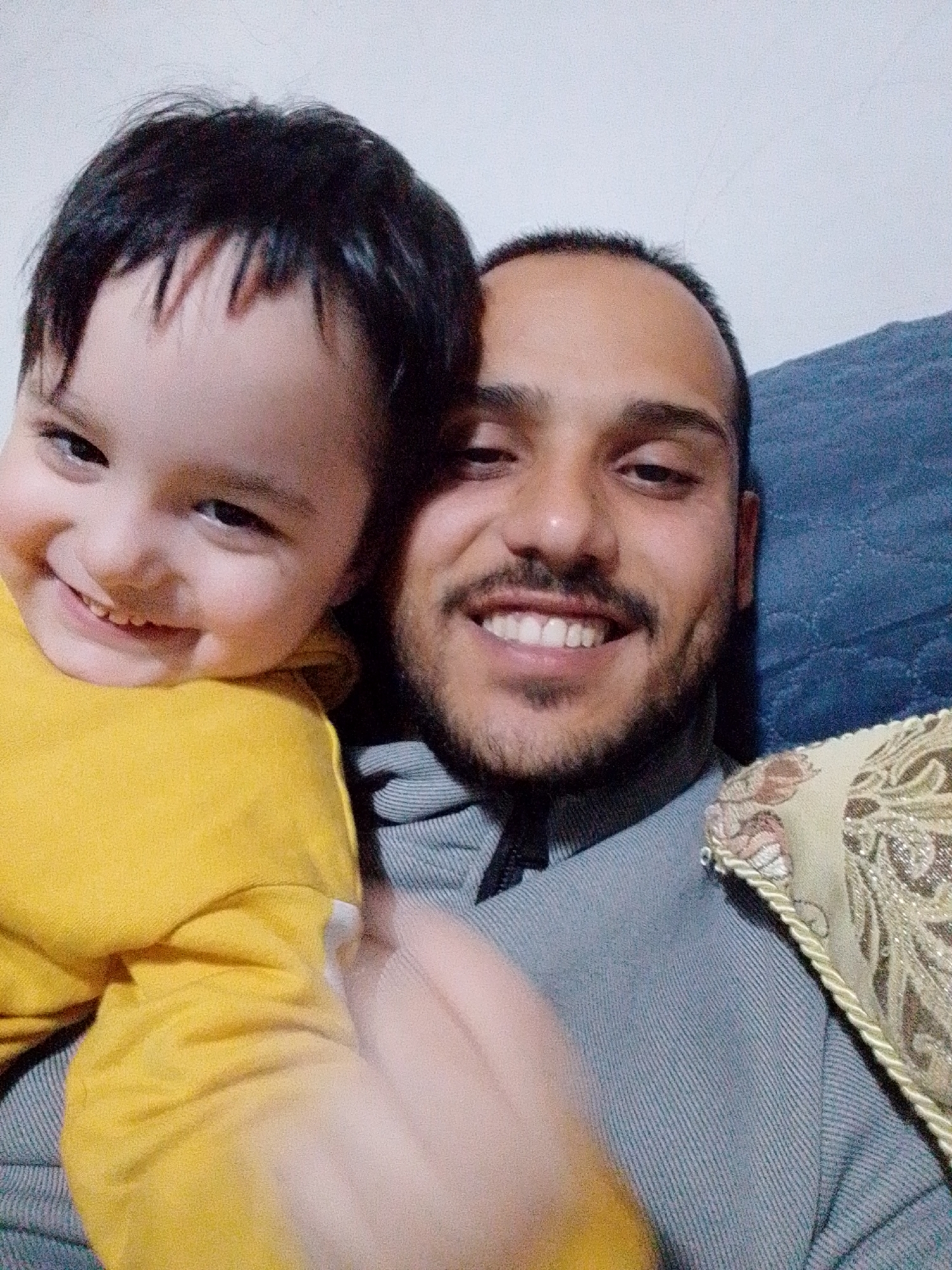 The image depicts a close-up indoor portrait of two individuals: an adult male and a young child, appearing to be a selfie. The scene takes place within a residential setting in the city of Limassol, Cyprus. The adult male, positioned on the right, appears to be in his 20s or early 30s, with short dark hair, a short beard, and dark eyebrows. He is wearing a grey long-sleeved garment with a ribbed or striped texture. He is smiling broadly, revealing his teeth. The child, positioned on the left and leaning against the adult male, appears to be between two and four years old. The child has dark hair with bangs and is wearing a solid yellow long-sleeved shirt. The child is also smiling broadly, revealing teeth, with wide eyes directed towards the camera. The background elements visible include a plain white or light-colored wall surface behind the child and to the upper left of the adult. To the right of the adult, a blue textured surface, possibly a cushion or part of a sofa, is visible. Below this blue surface, a cream-colored cushion with ornate gold and brown embroidery and a twisted cord trim is partially visible. The interaction between the two individuals indicates closeness and a positive disposition.