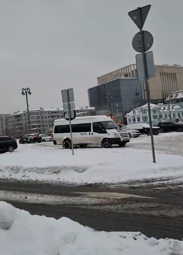 winter scene in what appears to be an urban environment. Snow covers the ground, with piles of it lining the streets and sidewalks. Cars and a white van are parked or moving along the snow-covered roads. There are several buildings visible in the background, including a modern-looking glass building and older, more traditional structures. Street signs are also visible. A person is seen walking on the snowy sidewalk. A poster is placed on a stand at the side of the road. The sky is overcast.