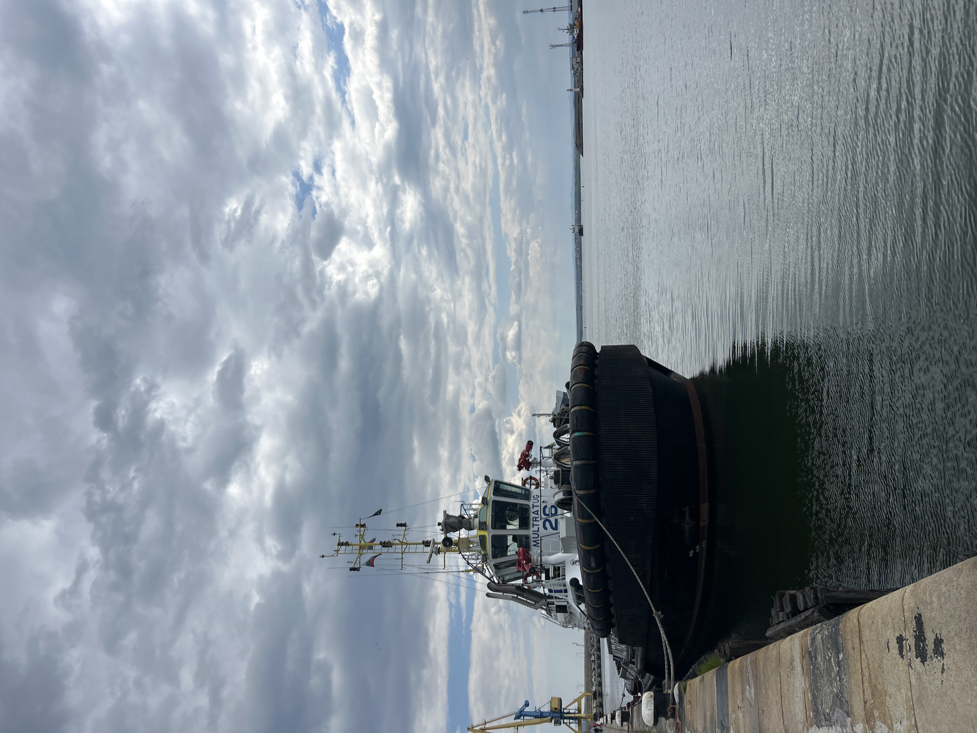 docked tugboat, the "Multratug 26", in Burgas, Bulgaria. The boat is secured alongside a concrete pier, with a calm body of water visible. The sky is overcast with heavy clouds. Cranes are seen in the distant background. The scene is static, depicting a vessel at rest.