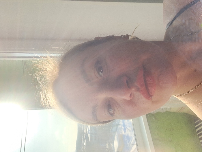 A woman's face is tilted, illuminated by sunlight. She has light skin, brown eyes, and light reddish lips. Fine lines are visible on her face. Her blonde hair is partially illuminated and standing out. She wears a thin gold necklace and a tank top. A window with greenery outside is visible in the background.