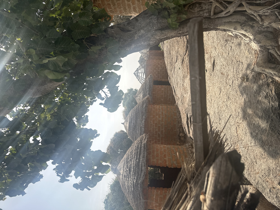 The image displays an outdoor scene at Gidan Madaki, Jos Museum, Jos, Nigeria, under bright, direct sunlight. The foreground is partially obscured by a blurred horizontal wooden beam or branch with visible thatch remnants on the lower left. The ground consists predominantly of large, light brown to grey rock slabs with interspersed sandy areas. In the midground, a line of five traditional, circular huts is visible. These structures are constructed from reddish-brown brick or mud, featuring conical roofs made of light brown thatch. The three huts closest to the viewer have fully thatched roofs, with dark, rectangular openings indicating entrances. The fourth and fifth huts in the background show partial or incomplete thatched roofs, revealing underlying wooden framework. No individuals are visible inside or around these structures. A large tree with a thick, gnarled trunk and extensive roots spreading over the rocky ground dominates the right side of the frame. Its dense canopy of green leaves extends across the upper portion of the image, with prominent sunbeams penetrating the foliage and creating noticeable light shafts. The background reveals a hazy, bright sky and distant green vegetation. The scene is devoid of human or animal presence.