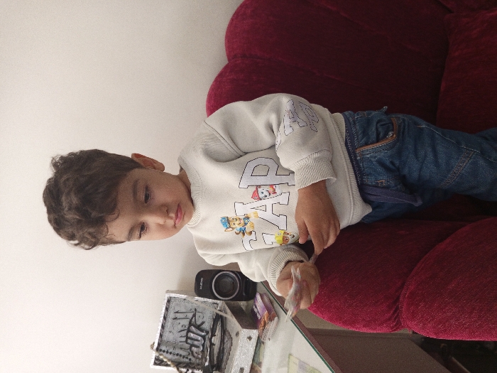 This image depicts a young male child standing in an indoor setting within Rukn ad-Din Municipality, Syria. The child, with curly dark hair and light skin, is wearing a cream-colored long-sleeved sweatshirt featuring "GAP" lettering and "Paw Patrol" characters, along with blue jeans that have a dark blue drawstring. He is positioned leaning against or standing in front of a dark red upholstered armchair, visible on the right side of the frame. The child holds several small, light-colored rectangular objects, possibly cards or folded papers, fanned out in his left hand, and his gaze is directed downwards. In the background on the left, a glass-topped table is visible, supporting a black speaker and a silver-colored decorative item with Arabic calligraphy, possibly reading "Allah." The wall behind the child and table is plain and light-colored.
