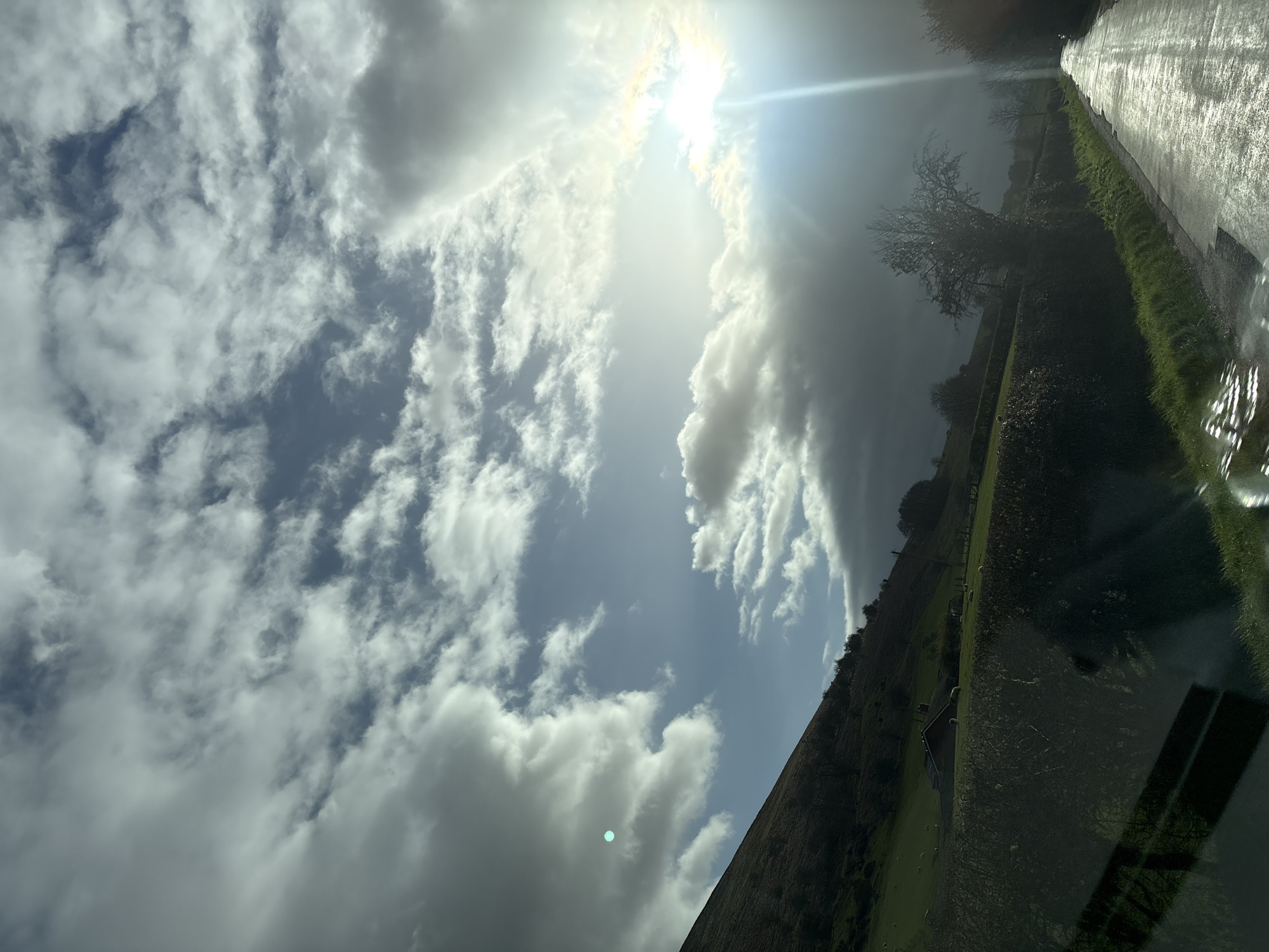 view from a vehicle, likely a car, as indicated by the portion of a car window visible in the bottom right corner. The scene includes a country road and a cloudy sky. A wet, paved road runs along the right edge of the image, with lush green grass bordering it. Adjacent to the grass is a hedge. The background is dominated by a hill covered in green vegetation and a few trees. The sky occupies the upper portion of the image, showcasing a mix of blue sky interspersed with thick, white clouds. The sun is visible, causing a bright glare. The location is possibly somewhere outside the city of Shrewsbury, United Kingdom. No people or specific interactions are visible in the frame.