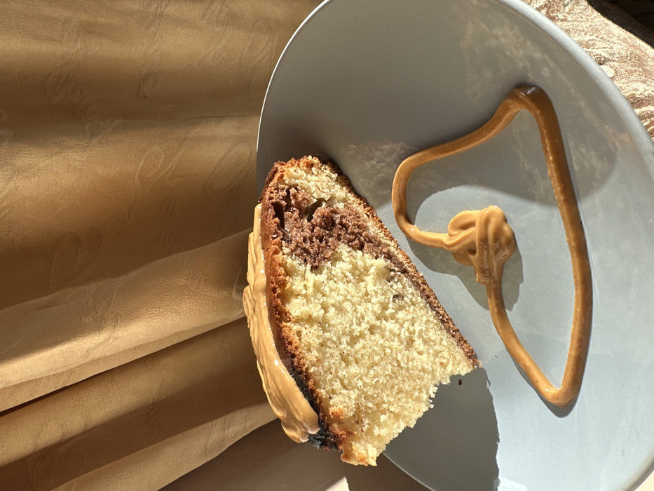 - "A slice of marbled cake, exhibiting a light and dark brown pattern, rests on a light blue-grey plate" by FM-f6bQw2, licensed under CC BY 4.0