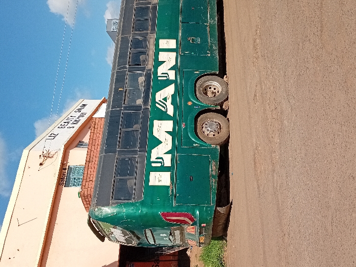 A green passenger bus, bearing the white inscription "IMANI" on its side, is parked on an unpaved, earthen surface in Embu, Kenya