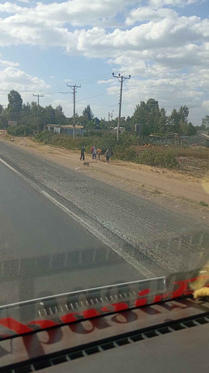 A group of people walk along a dirt road next to a paved highway. One person appears to be guiding a sheep or goat. In the background, there are power lines and houses with trees. The sky is blue with fluffy white clouds. The image is taken from inside a vehicle, showing part of the dashboard.