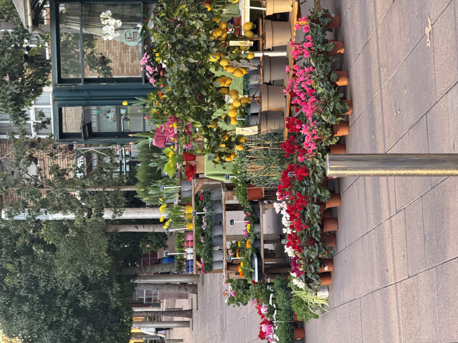 A vibrant display of potted plants lines a sidewalk. The plants, in shades of red, pink, white, yellow, and green, are arranged on tiered wooden shelves. A lemon tree is visible among the flowers. A building with a dark green storefront is in the background, partially obscured by trees. A metal pole stands on the sidewalk. The pavement has a tiled pattern.