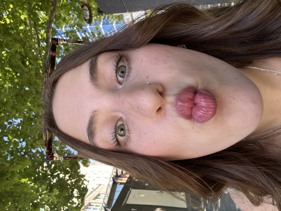 A young woman poses outdoors, tilting her head and pouting her glossy lips towards the camera