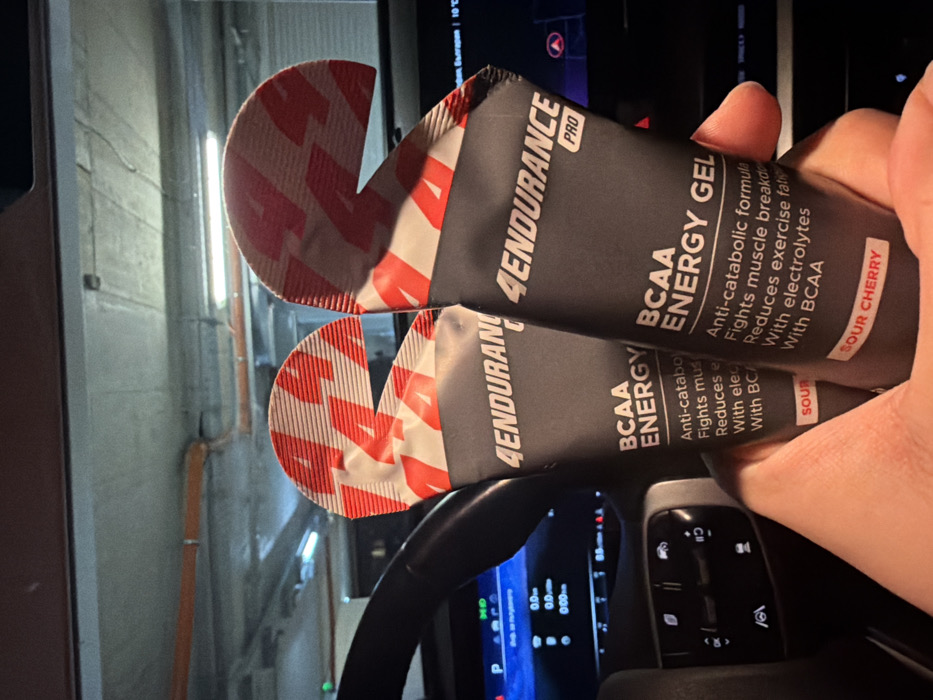A hand holds two "4ENDURANCE PRO BCAA ENERGY GEL SOUR CHERRY" pouches within the interior of a vehicle, positioned in an underground parking garage in Sofia, Bulgaria